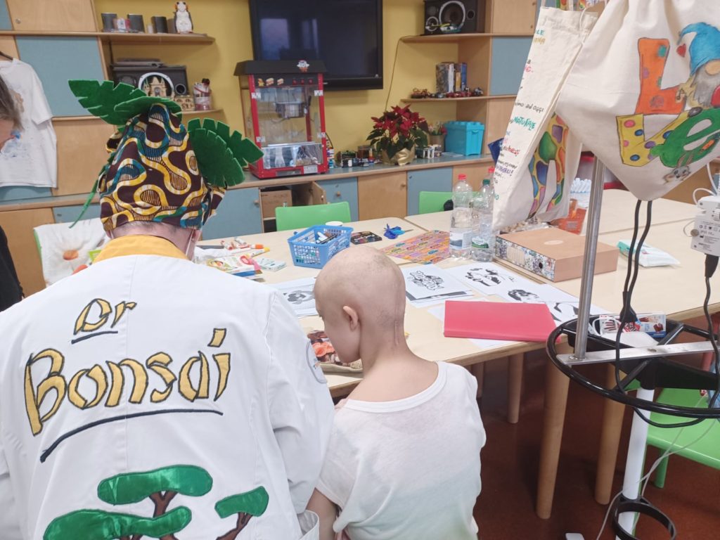 Nella prima stanza c’era un bambino di 4 anni; lo conosciamo, abbiamo giocato molto nelle ultime settimane. Ma ora è sdraiato con gli occhi semi-chiusi, è sedato per non sentire, ma il dolore lo porta la sua mamma che, appena ci vede, si lascia andare in un lungo abbraccio.